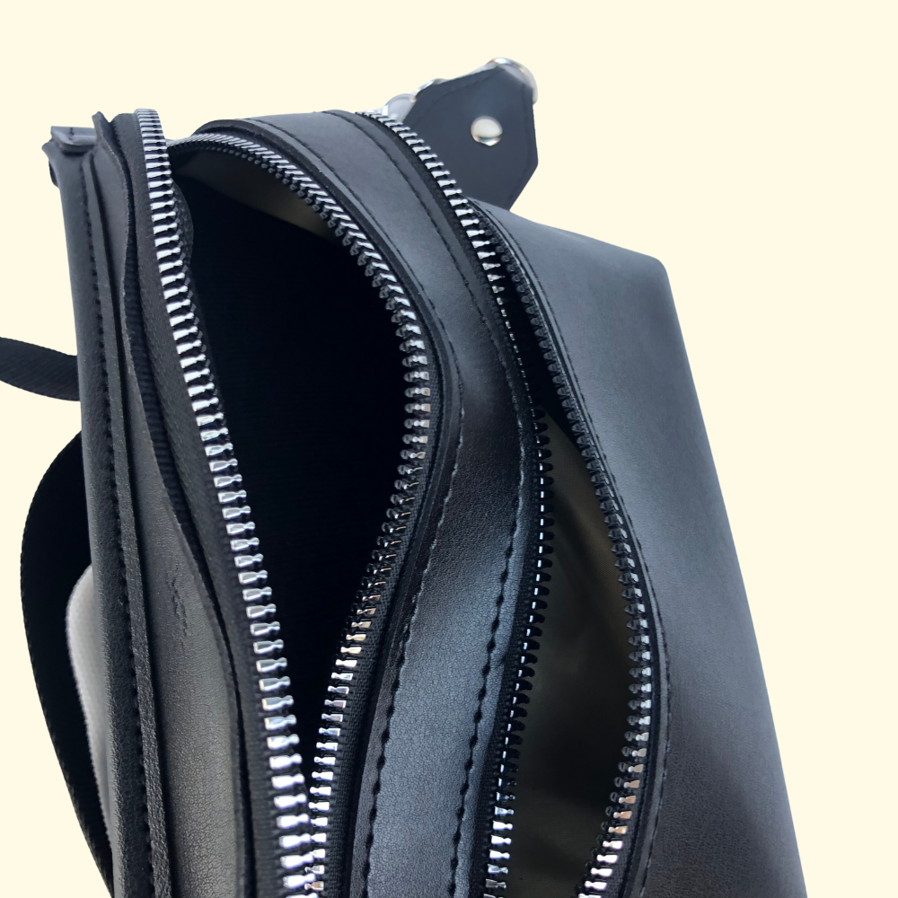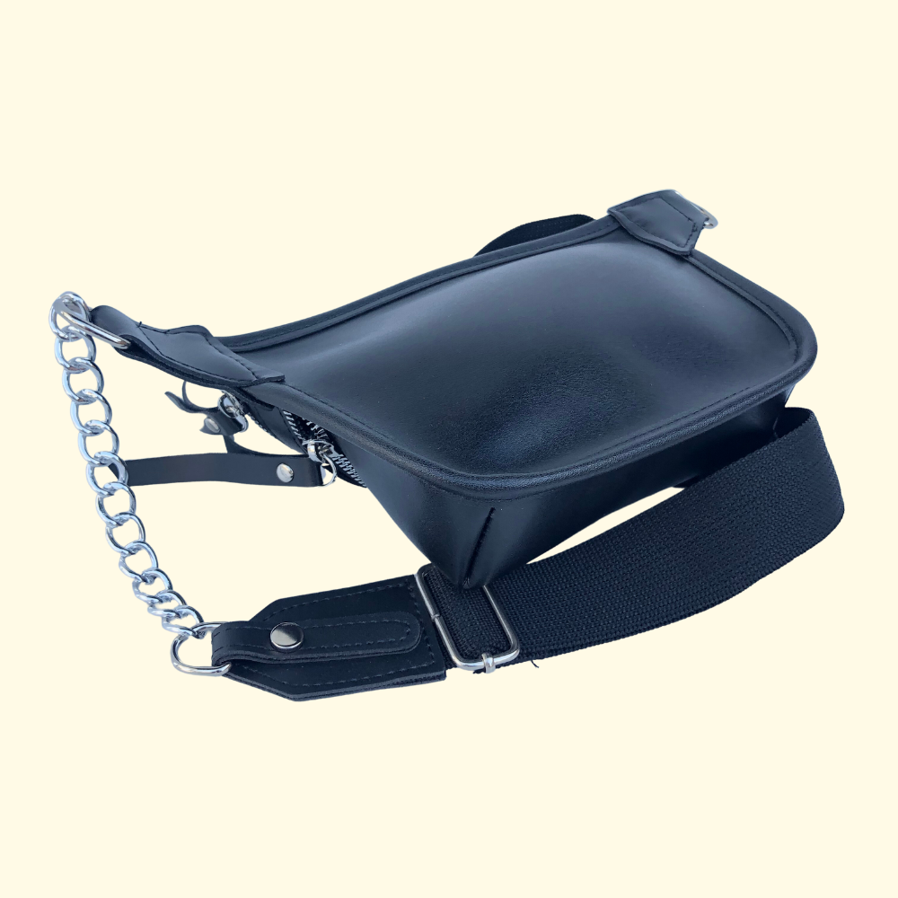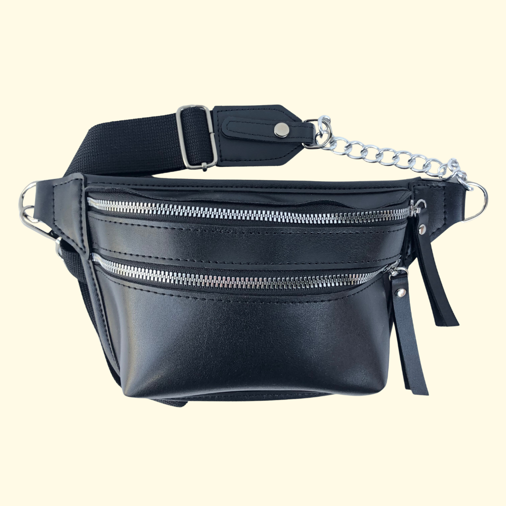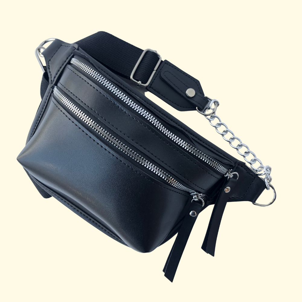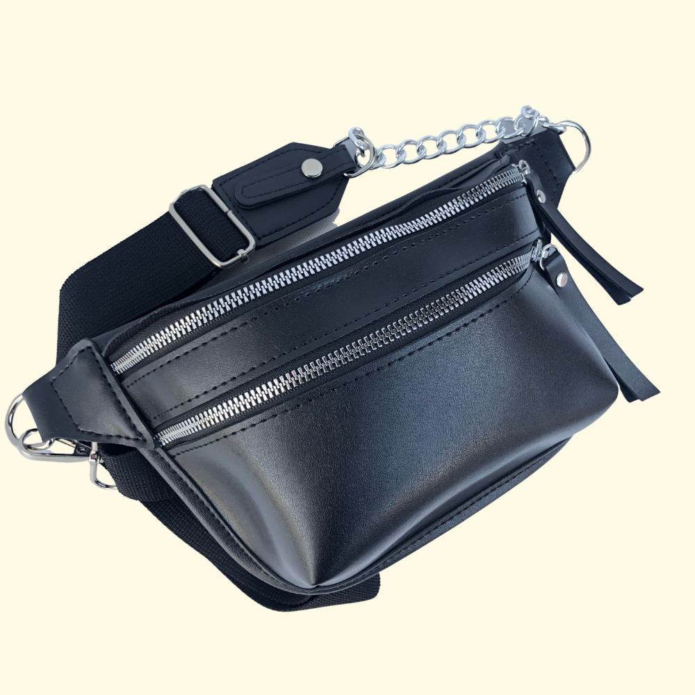 Зручна та містка модель. Має два відділення на блискавці, одне більше, для телефону, а друге - менше, для іншого дріб'язку. До бананки за допомогою карабіну кріпиться плечовий ремінь, який можна регулювати. Частина ремінця виконана у вигляді ланцюга. Незамінна річ у сучасному світі.